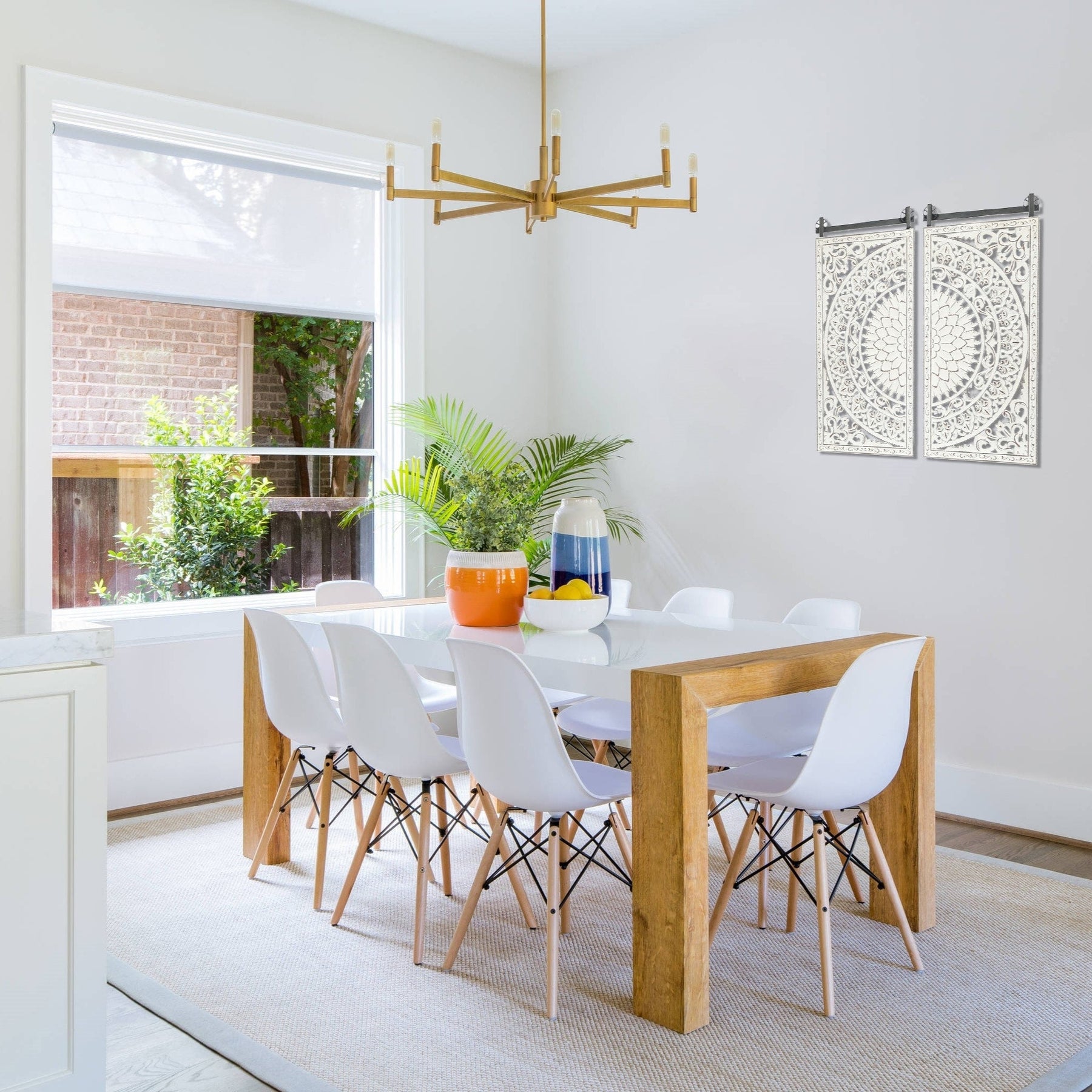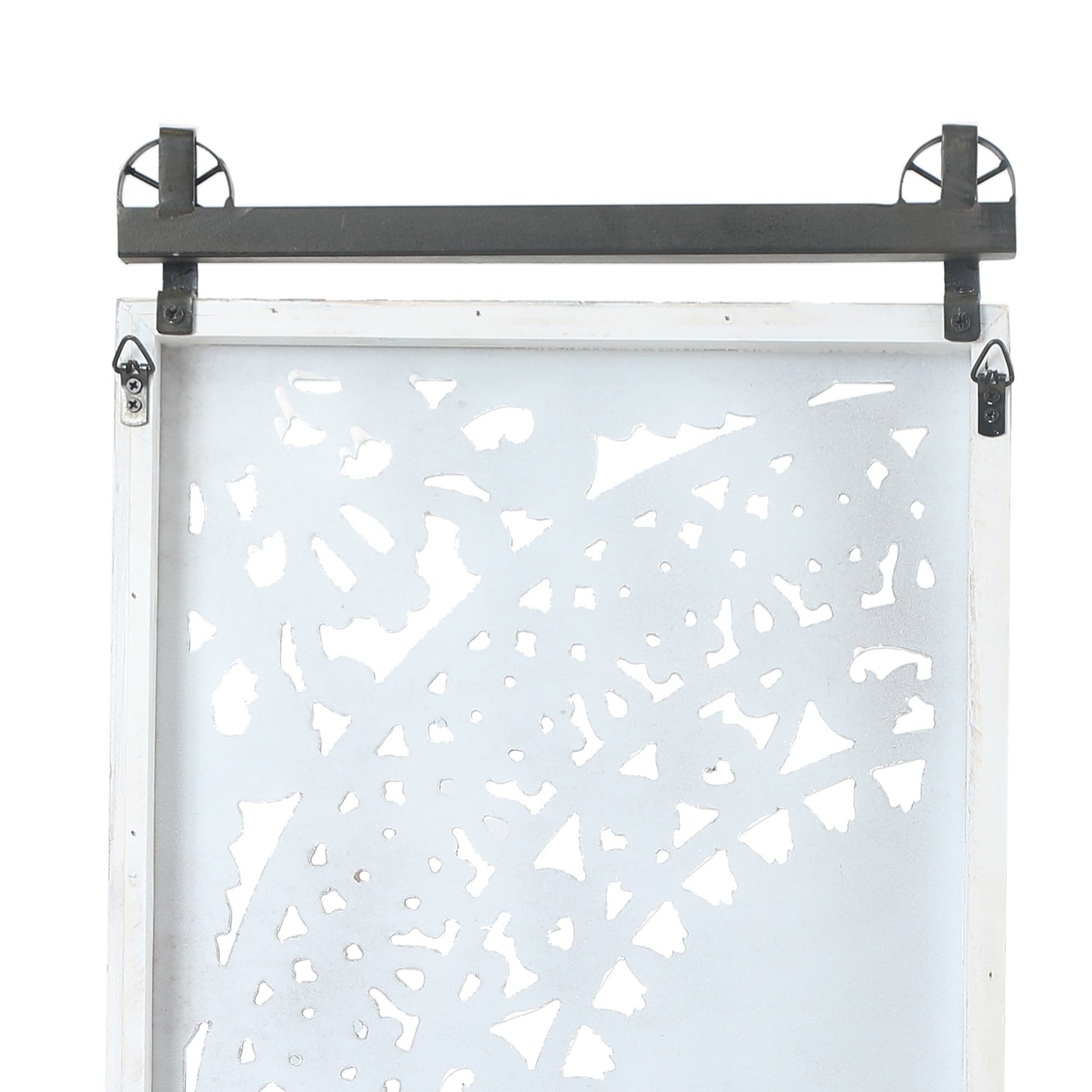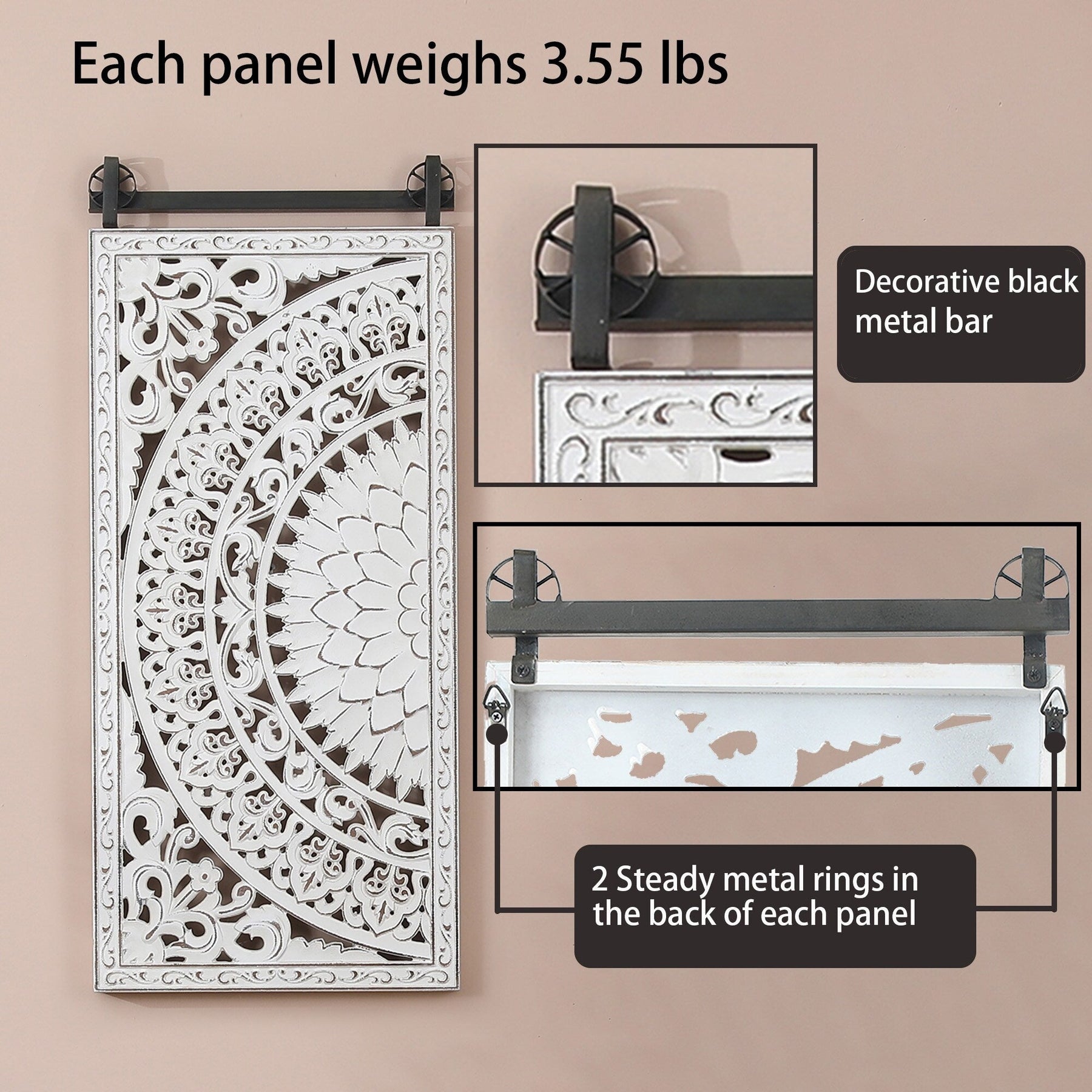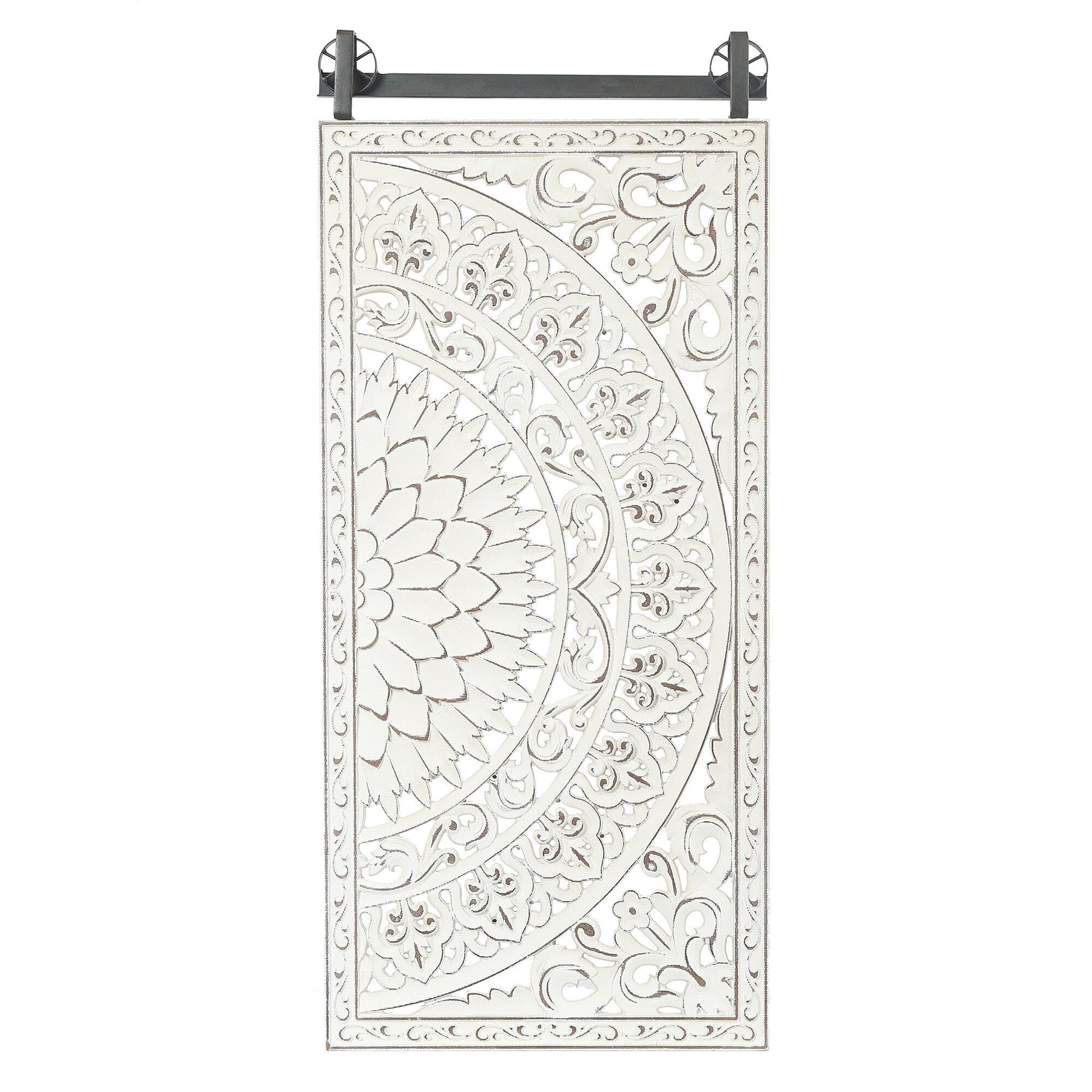 Looking to add some freshness, charm, and romance to your home decor? Look no further than this gorgeous 2-piece hand-carved floral-patterned wall decor set. Each piece is lovingly crafted from high-quality manufactured wood, with a beautiful carved flower design and raised details in soft ivory white with brown highlights for added depth and vintage appeal. The panels are attached to a sturdy weathered black iron bar, giving the set a modern farmhouse feel. Easy to mount with two metal D-ring brackets, this stunning wall art is sure to catch the eye and complement any interior design. Don't settle for a boring empty wall - give it the lift it deserves with this beautiful floral wall decoration.