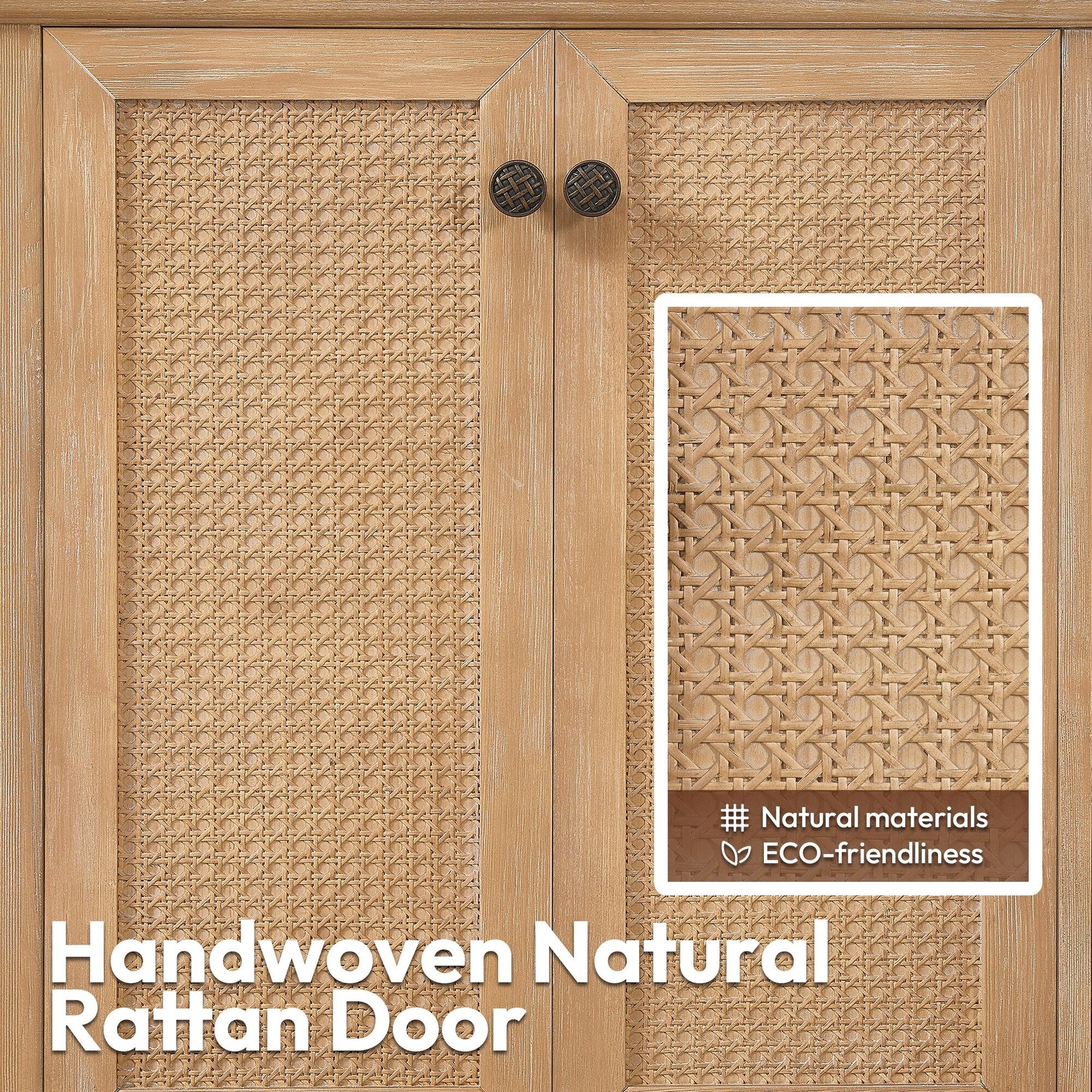 70 inch - Four soft-closing doors with a rattan bamboo panel and three sturdy, soft-closing dovetail drawers.