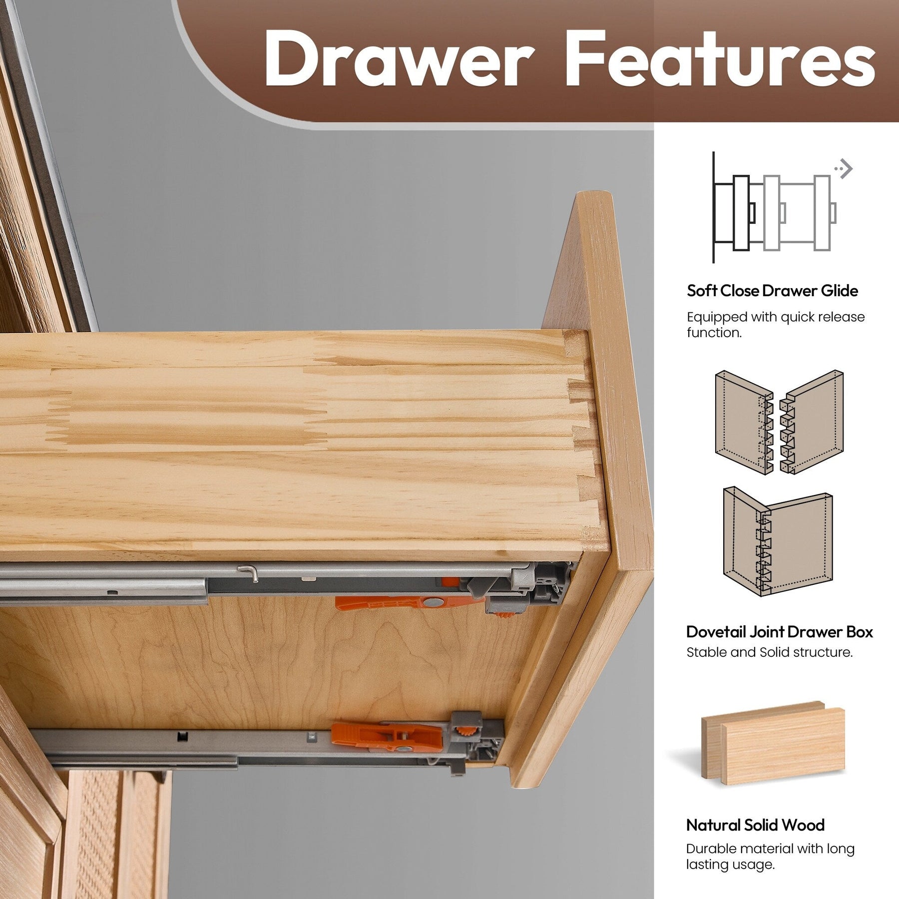 36 inch - One soft-closing door with a rattan bamboo panel and three sturdy, soft-closing dovetail drawers.