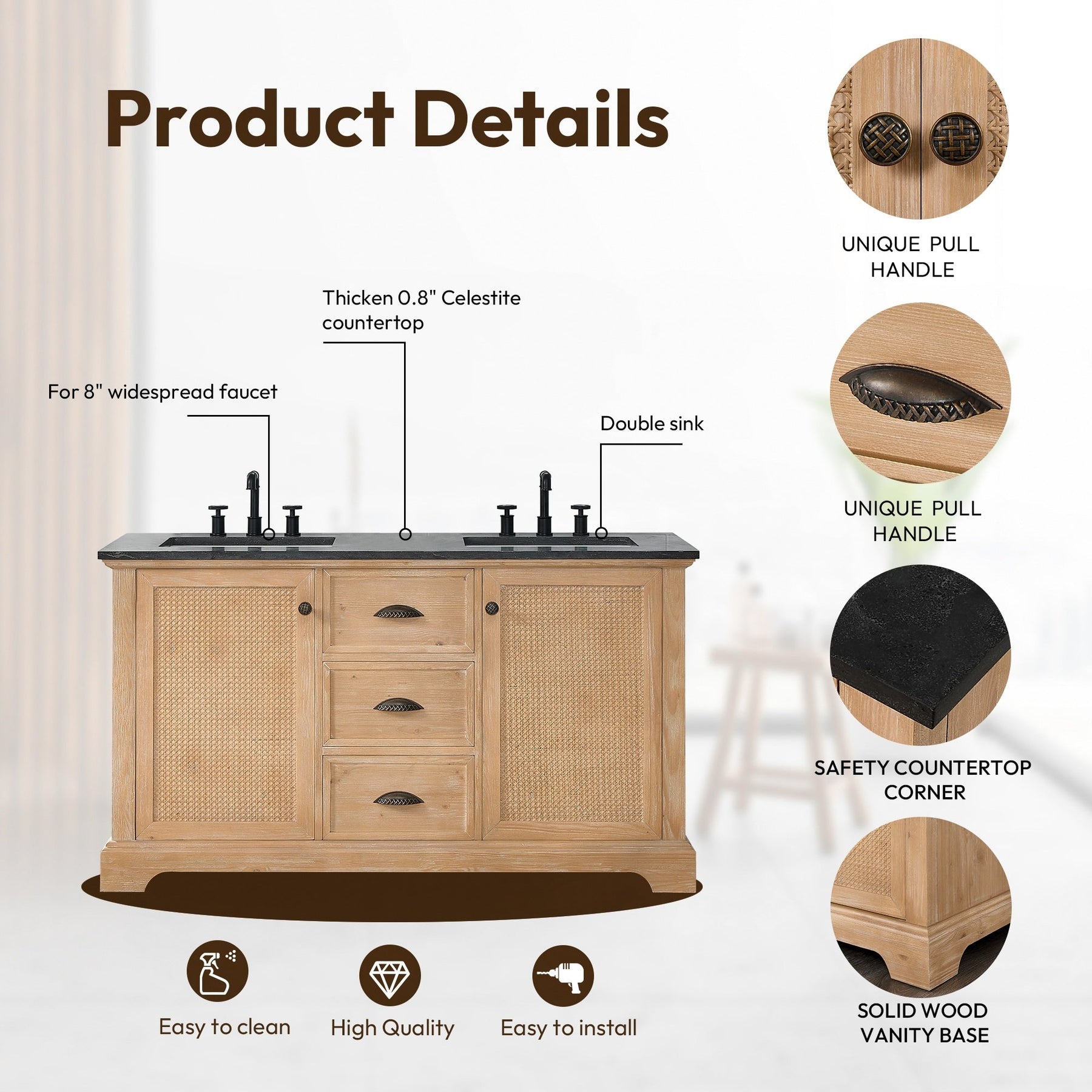 · Faucet Type: Countertop has pre-drilled, standard 8-inch widespread faucet holes.