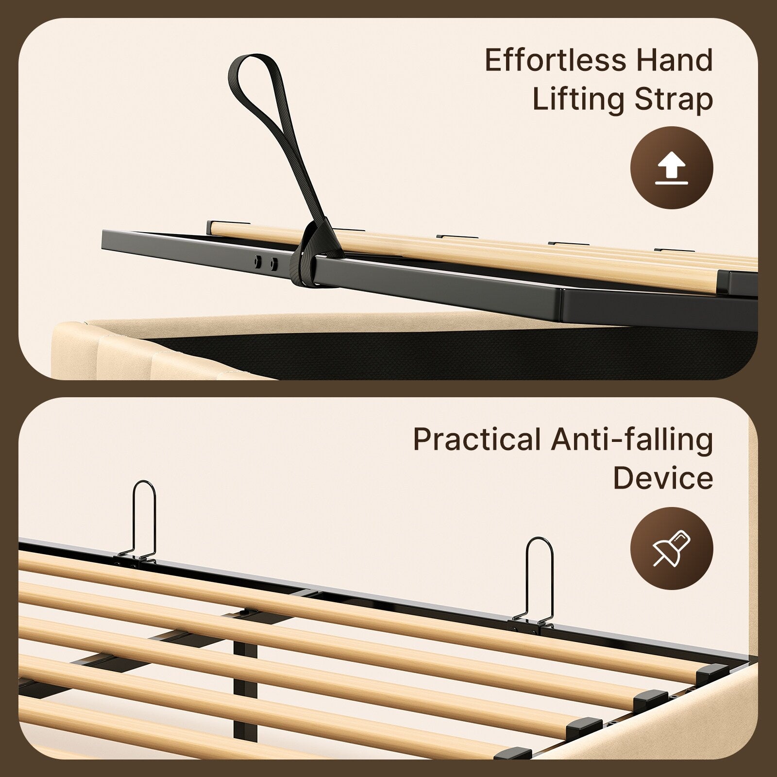 •  Maximized Storage: The lift-up mechanism offers a large storage area for bedding, clothing, shoes, or any other items you want to keep out of sight, helping to declutter your bedroom.