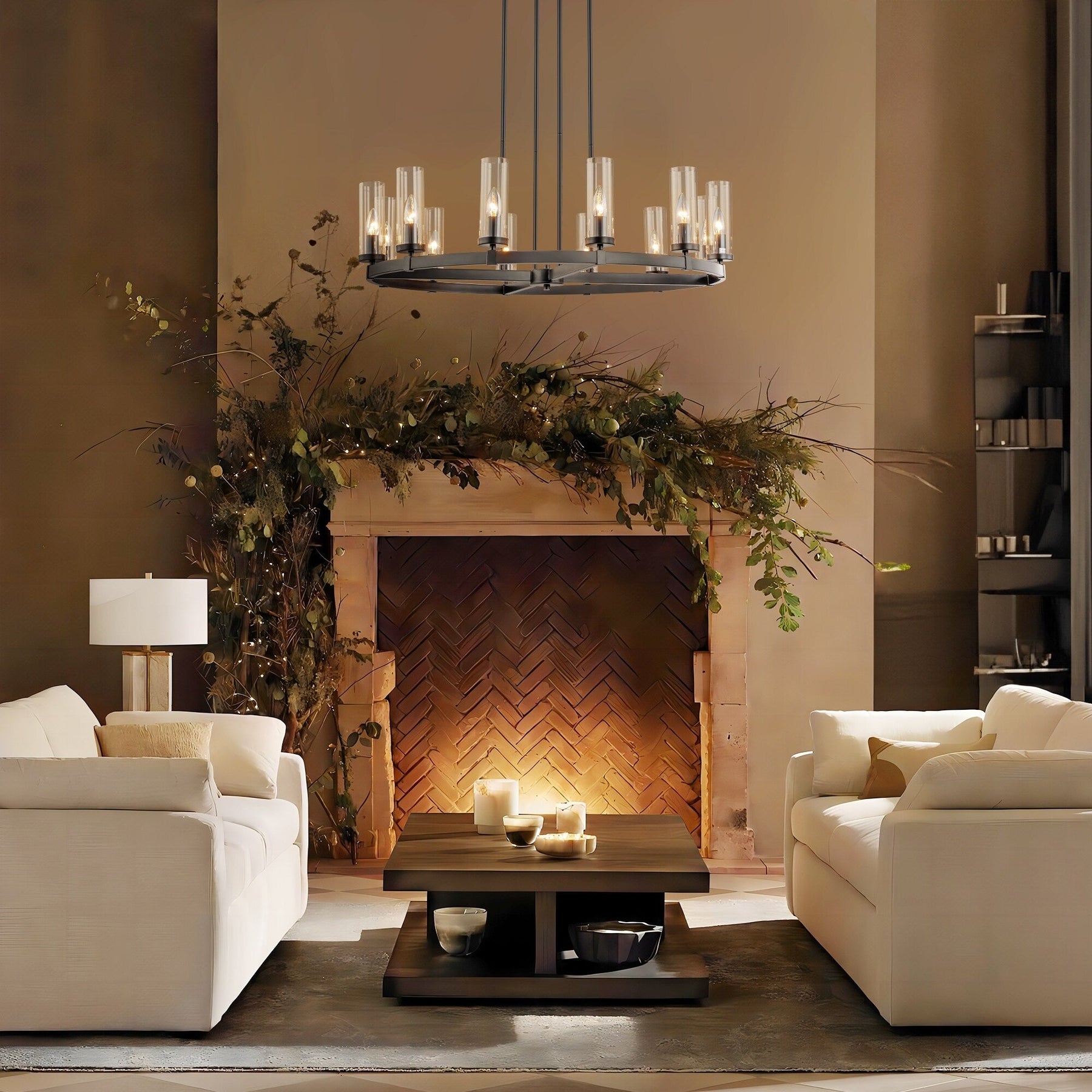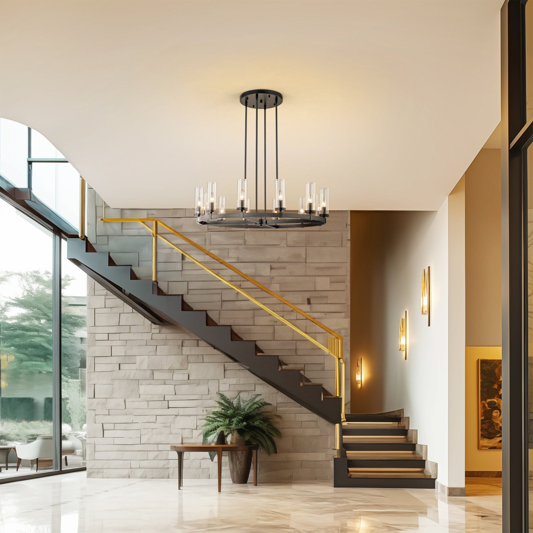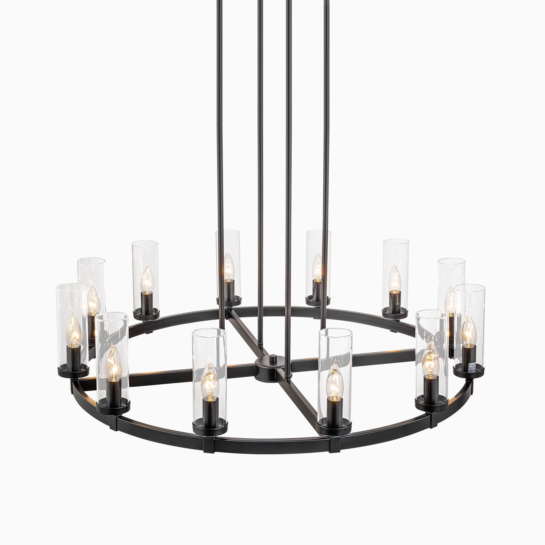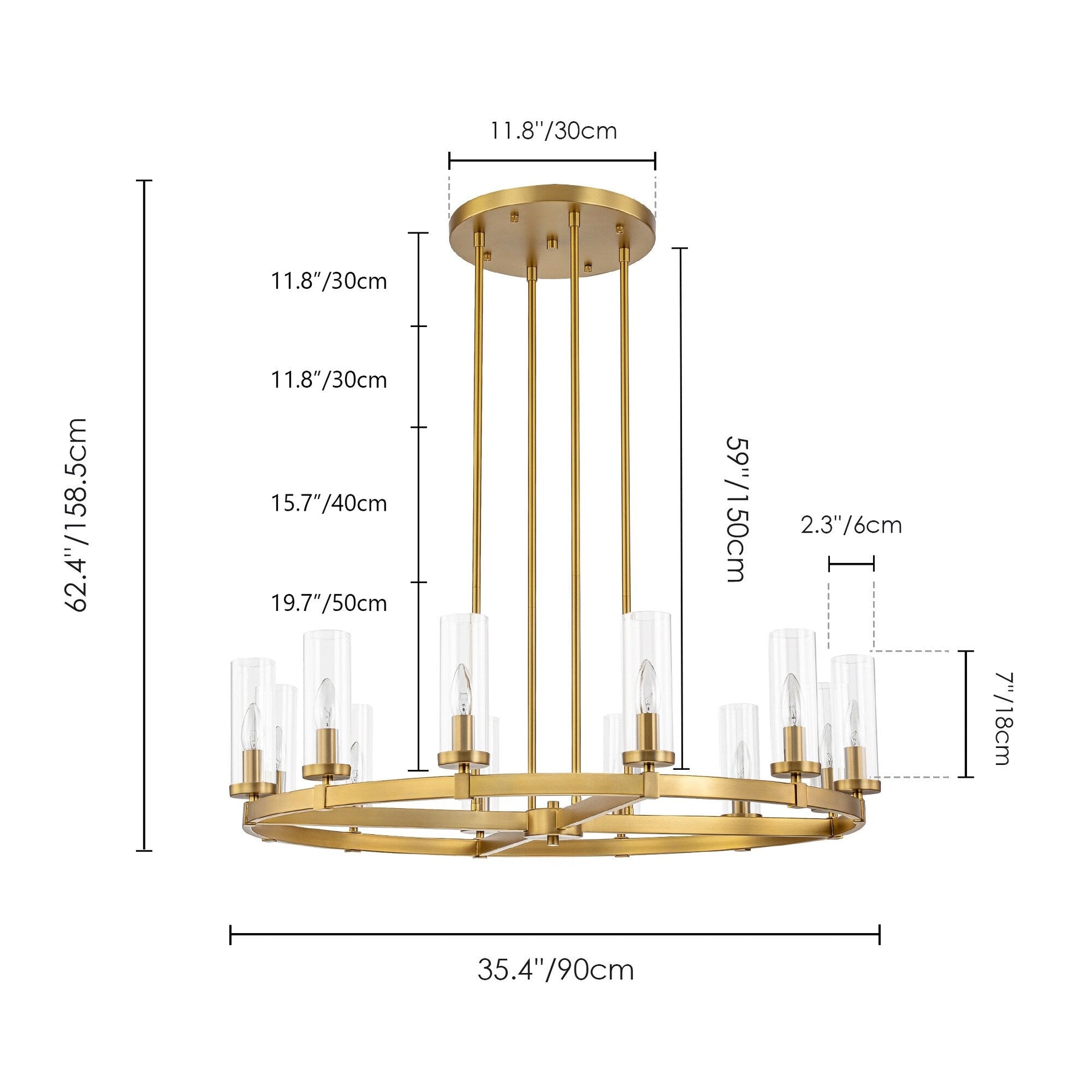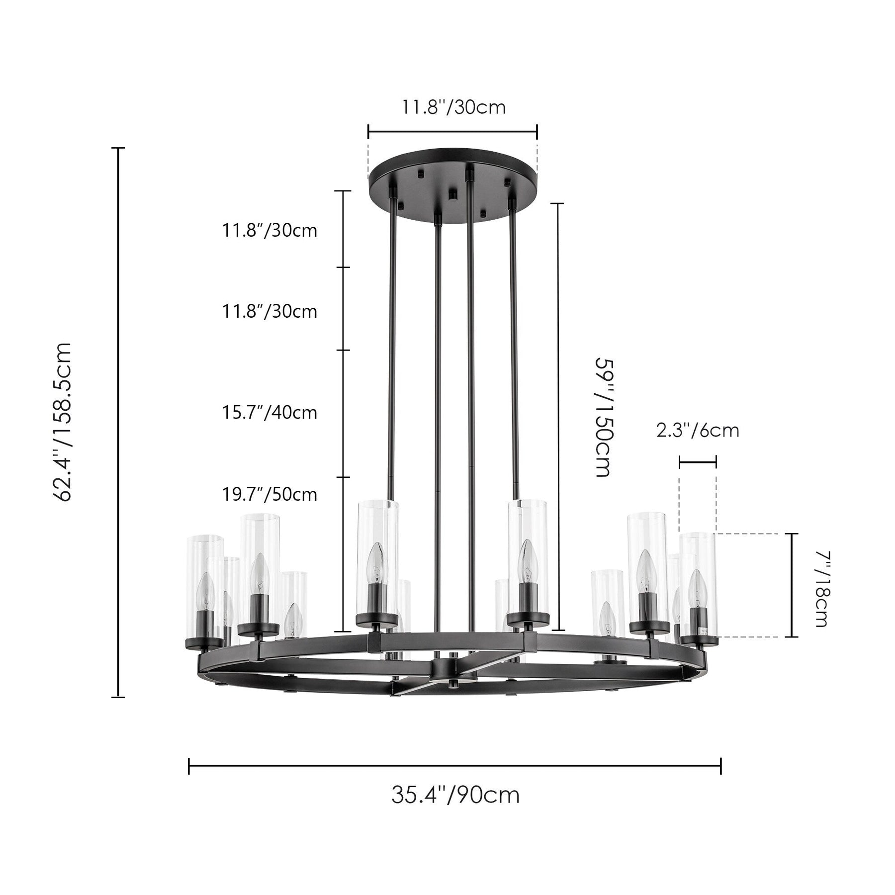 This 12-light retro industrial circle wagon wheel chandelier clear glass island light with a 35.4-inch diameter stands as a testament to unparalleled craftsmanship and design ingenuity. The lighting goes through the pure-clear glass shade and imparts a soft and ample illumination, casting a luminous aura that gracefully envelops your living space. Meanwhile, this opulent fixture showcases a distinctive wheel-shaped frame and elegantly cylinder candlestick-style bulbs (not included) design, exuding a commanding presence with a pronounced vintage industrial aesthetic.
