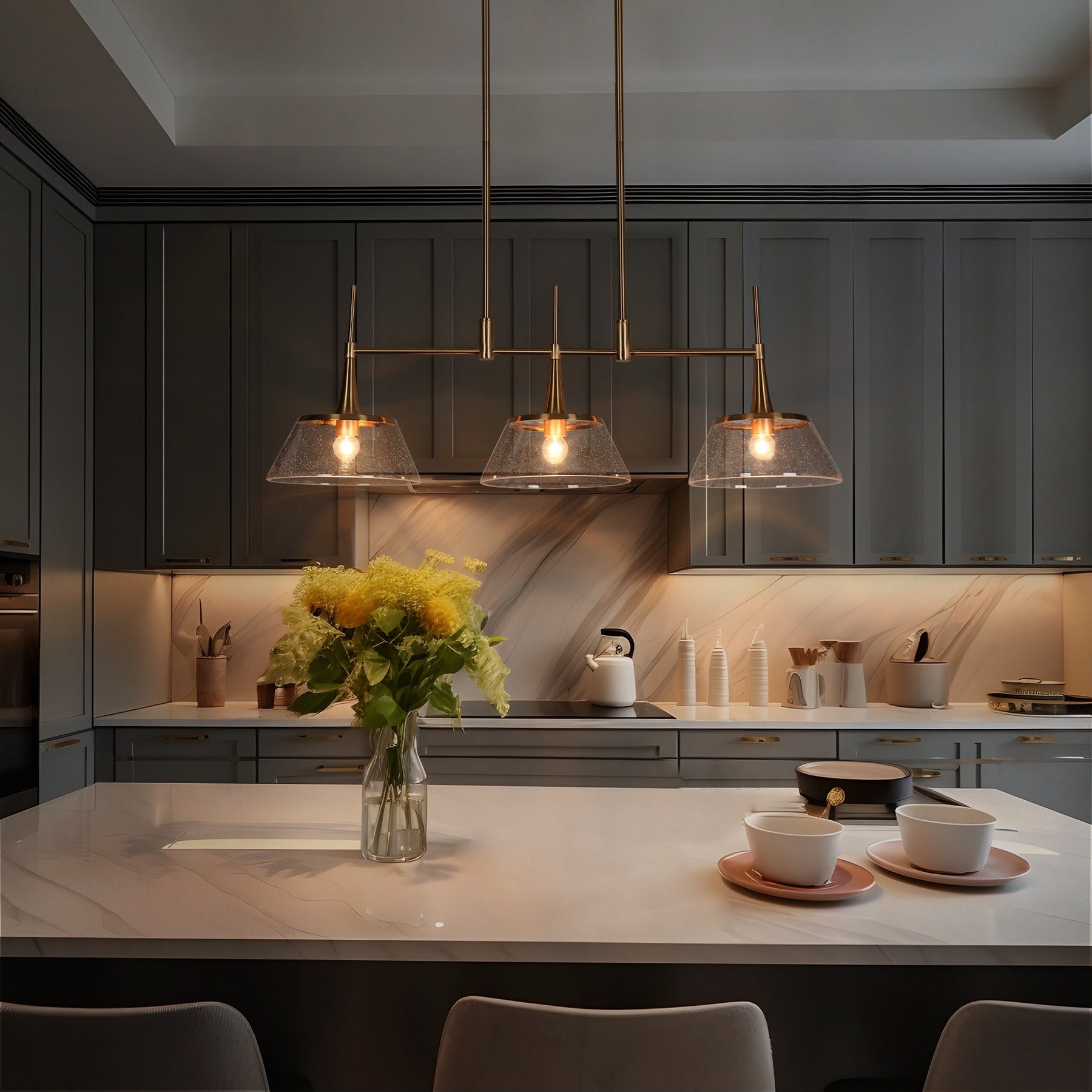 Meet the Mola Collection—a fresh interpretation of mid-century style that brings a sophisticated, modern aesthetic to your home. This chic chandelier showcases a sleek, linear design with beautifully seeded glass shades, all framed by a delicate metal ring that adds a sense of balance and elegance. Faceted sockets and horn-like lamp poles, finished in a brushed electroplated gold, lend a textured and refined look that elevates the piece. Perfect for hanging above a kitchen island, dining table, and more, the Mola Collection is sure to be a captivating focal point in any space.