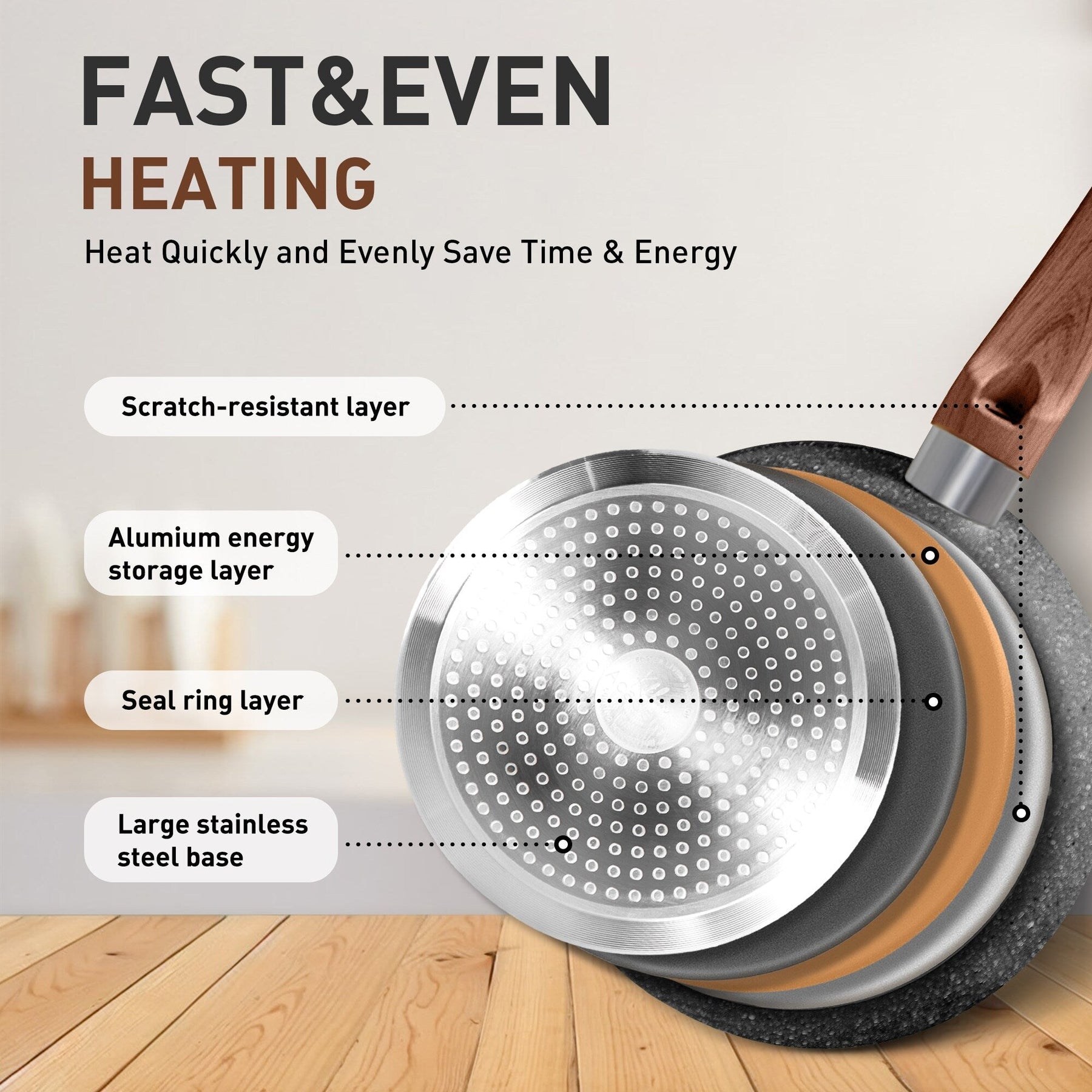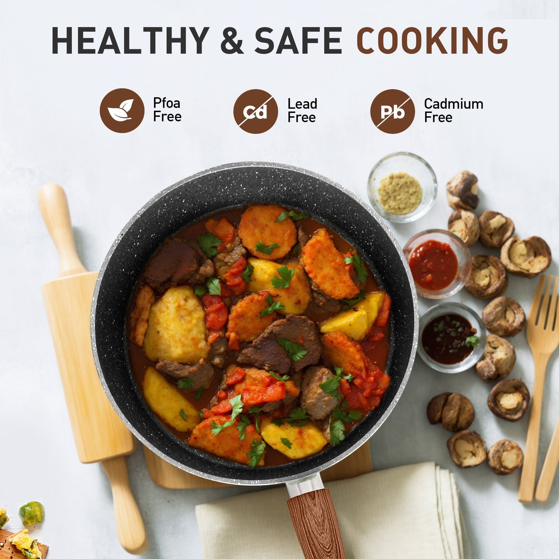 No Toxin Cooking Pans Set: When purchasing a new kitchenware set, please make sure it clearly states that it is lead-free, PFOS-free, and PFOA-free. Cooking pans cannot contain these three substances as they pose potential risks to the body. Fortunately, you can get granite cookware that is free of these harmful chemicals. For more healthy & Eco-friendly.