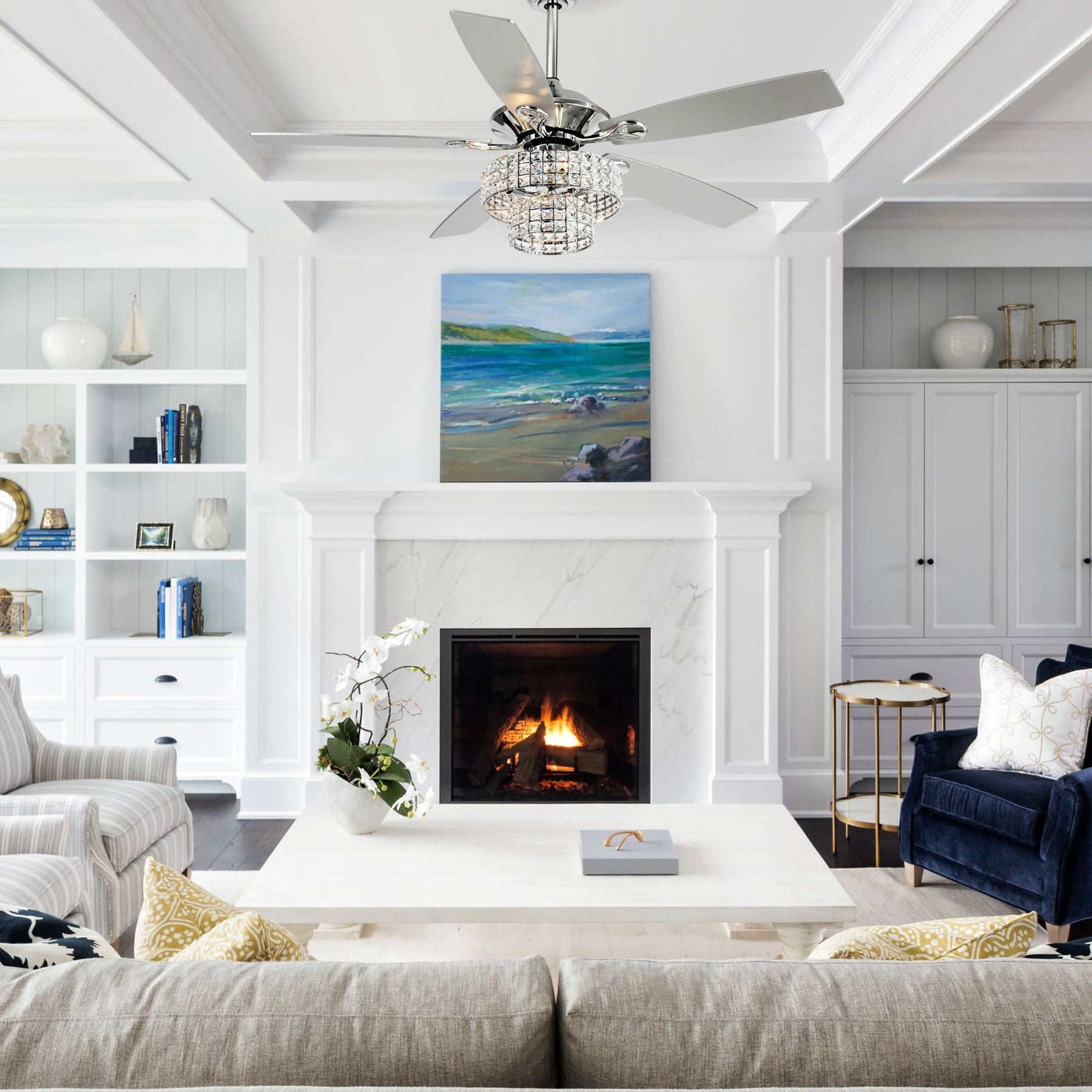 Elevate the style of any room with this stunning dual crystal shade modern ceiling fan with remote from Parrot Uncle. The two-tiered shade features crystal-embedded stamped metal walls, adding a touch of elegance and luxury to your home. The included remote control allows you to easily adjust the fan speed and control the light from a distance, while the reversible AC motor ensures year-round comfort. This contemporary-style unique chandelier ceiling fan is perfect for living rooms, bedrooms, dining rooms, kitchens, and patio areas up to 400 square feet.
