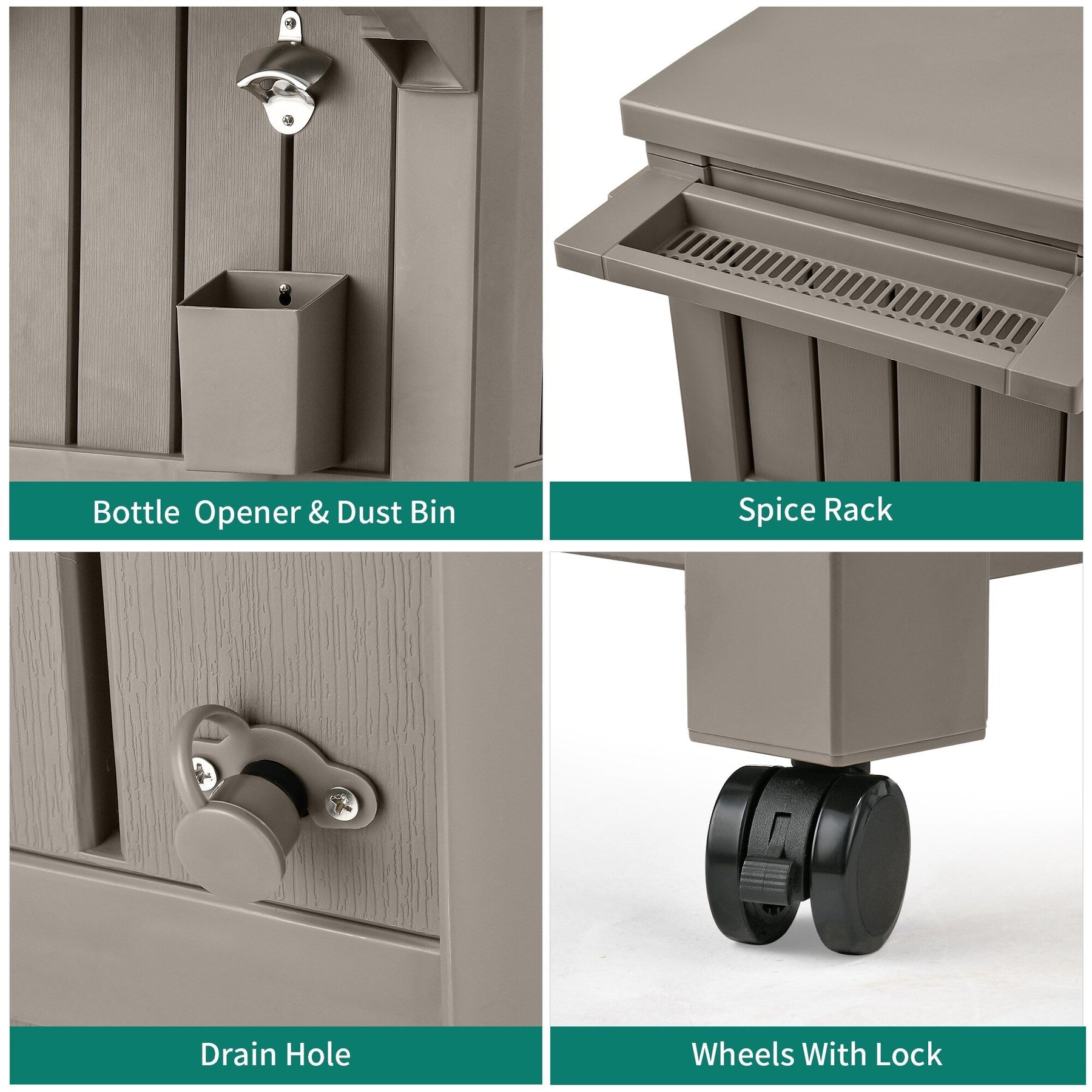 LARGE CAPACITY- This patio cooler cart comes with an 85 qt/21 gallon ice bucket and open storage to chill your beverages for hours.MULTIFUNCTIONAL ACCESSORIES- Features versatile distinct designs including bottle opener, matching trash can, spice rack, and bottom storage space for convenience, as well as the PVC ice bag with drain holes to easily replace water or ice cubes.LOCKING CASTERS- The rolling cooler ice chest enjoys 4 multi-directional rollers, 2 of which are lockable to hold the cooler in place for extra stability on uneven surfaces.QUICK ASSEMBLY- This outdoor beverage cart is made from recyclable and durable resin for easy maintenance; Simply follow the included instructions for an easy installation.PREMIUM MATERIALS- Our Rolling Cooler Carts are built using all-weather resistant resin featuring natural wooden texture for great durability, protection against peeling and denting, a sleek look, and minimal touch.