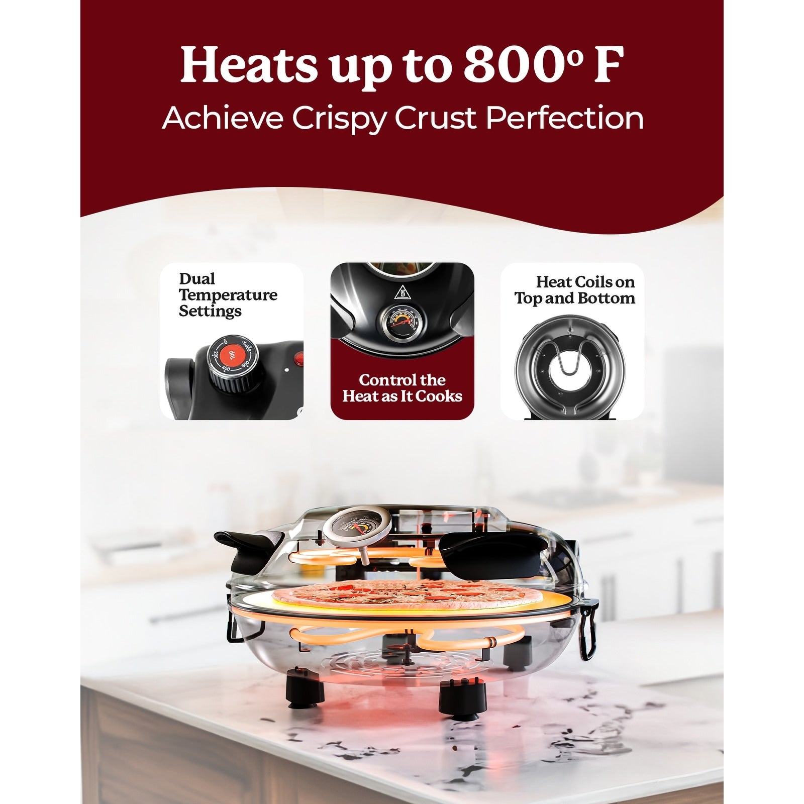 Perfect Pizza Every Time: Achieve restaurant-quality pizzas with ease. The 12' ceramic stone delivers a crispy, golden crust, while the dual temperature control allows for precise baking from top to bottom. Cook your pizza in under 6 minutes at temperatures up to 800°F.