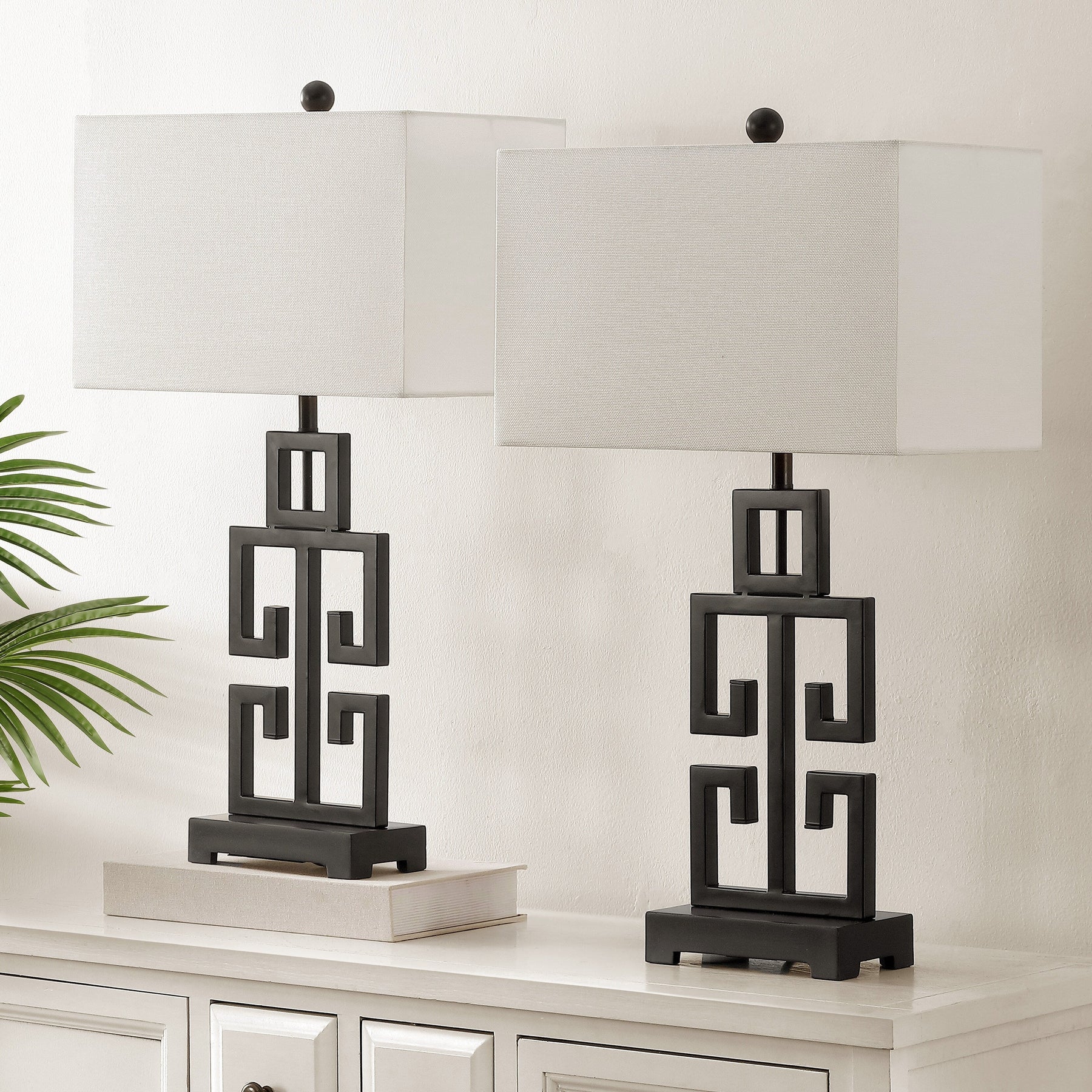 Infinitely versatile and adaptable to myriad decorating styles, the set of two Key table lamps stars the iconic Greek symbol for infinity. This design is crafted of antique gold finished metal with a rectangular box shade in white textured cotton.