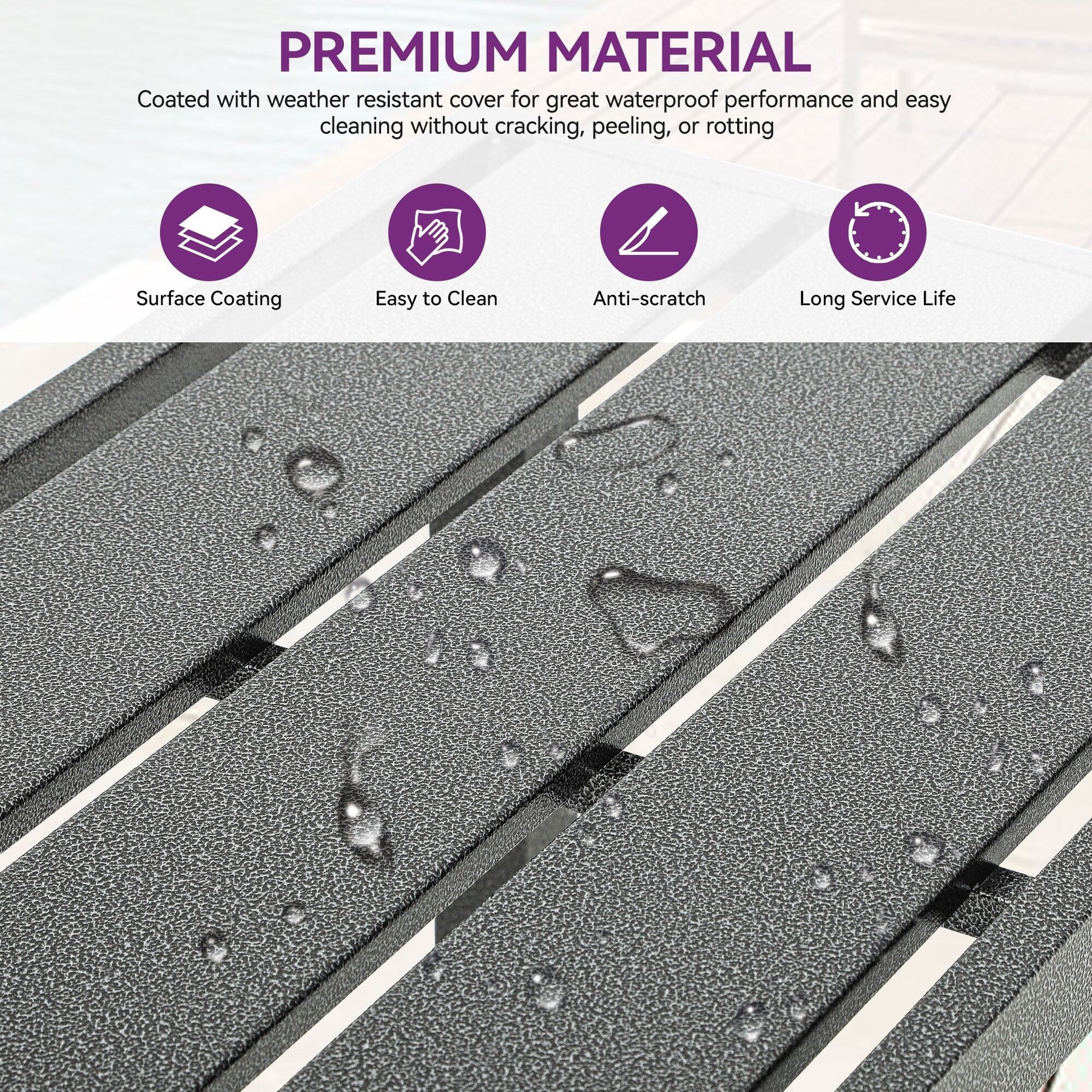 Our Outdoor Bar Table is a sleek and sturdy addition to your outdoor space. Made of high-quality metal with a powder-coated finish, this table is durable and sturdy and boasts 265 lbs weight capacity, thus it can effortlessly withstand heavy loads. Plus, the convenience of having wheels on one side allows for easy mobility and repositioning.