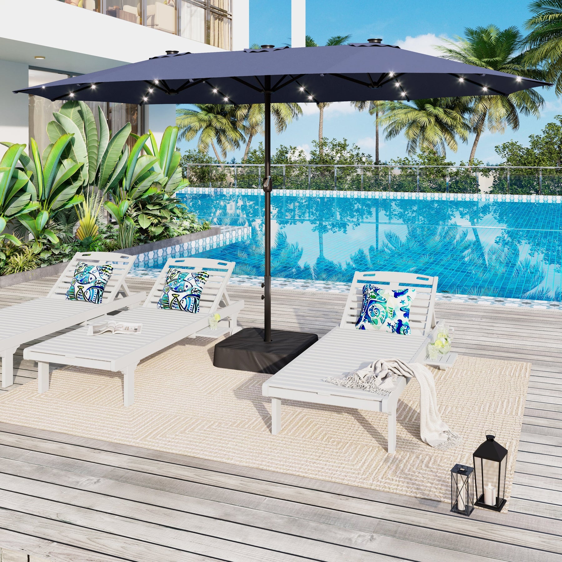 Transform your outdoor area with this stunning 15ft Double-Sided Patio Umbrella. Enjoy effortless opening and closing with the user-friendly crank lift that works in just 5 seconds. The beautiful canopy is made from 100% polyester, ensuring it is waterproof, fade-resistant, and UV-protected, providing you with breathable comfort in any weather. Plus, it comes with 36 LED lights (3 on each rib) powered by 3 solar panels, creating a cozy atmosphere with an automatic charging system for your convenience.