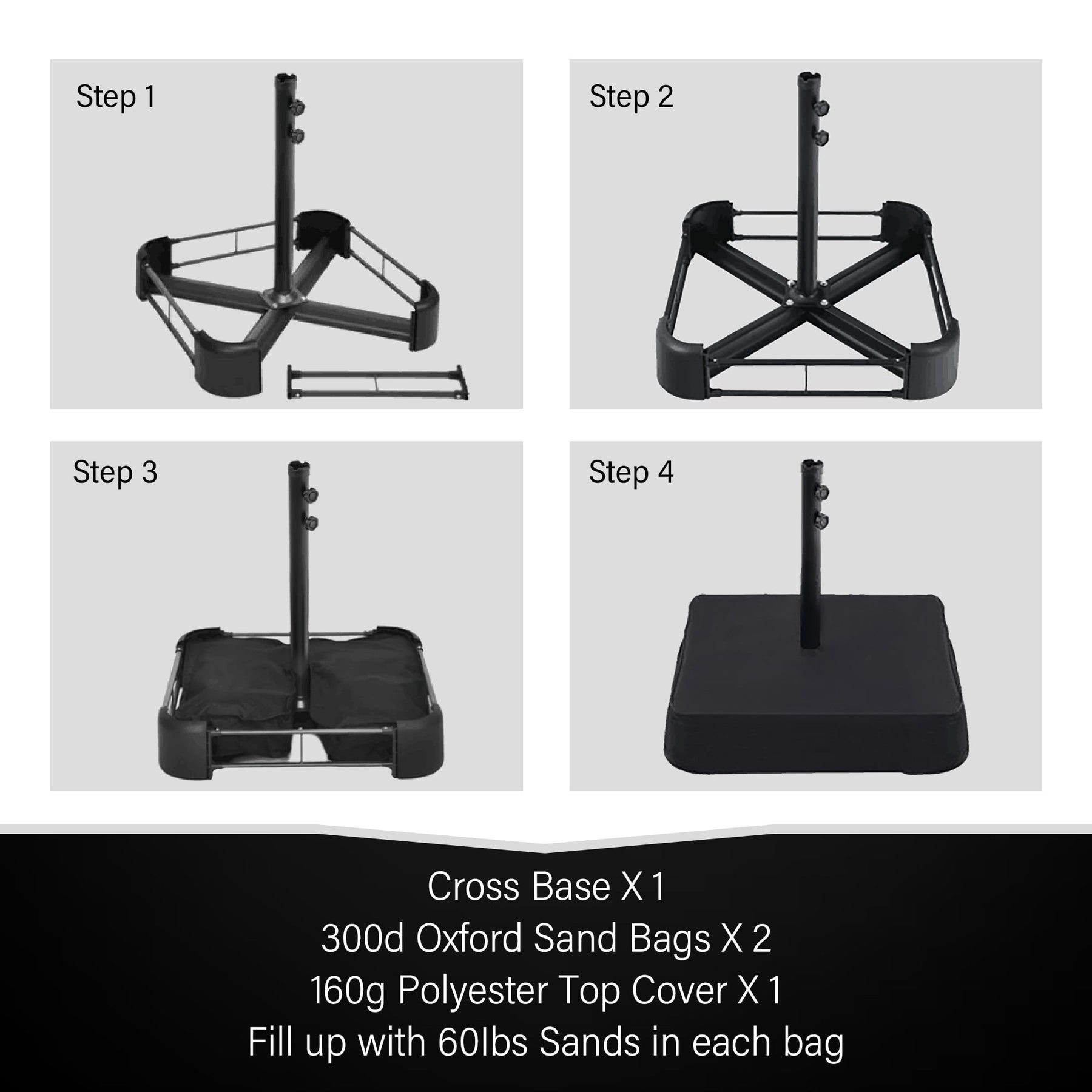 Umbrella Base Included for Easy Setup: Comes with a sturdy steel cross base along with two durable sandbags made of 300D Oxford fabric and one top cover from 180G polyester fabric. We recommend using 100 lbs of sand for each bag to ensure stability.