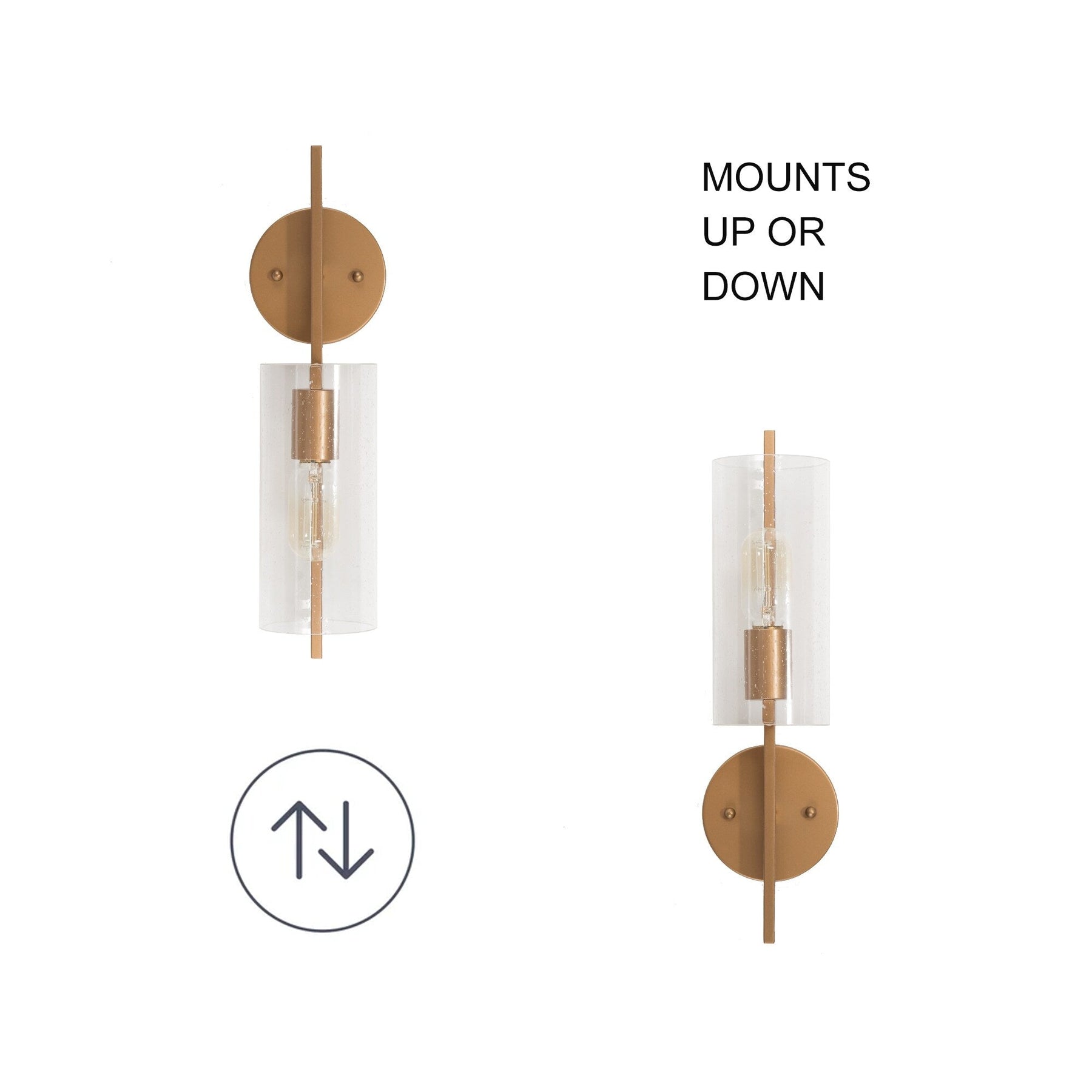 Looking to lighten up a dim room? If you can't sacrifice square footage, a wall sconce is a great option for (literally) brightening bare walls with a pop of decor and illumination. Achieve the perfect balance of lighting in your home with our dimmable Glass Wall Sconce. With its exquisite gold finish and cylindrical seeded glass shades, this fixture creates a captivating and enchanting ambiance in any space. Designed for both dry and damp locations, it's ideal for your bathroom, bedroom, entryway, stairwell, kitchen or living room. Install it horizontally or vertically to suit your preferences and enjoy the versatility and elegance this wall sconce brings to your interior. Space saving lamp: Mounting on the wall, this wall sconce serves as the tasking lighting without occupying your valuable space. Any after-sale requests, please contact Customer Care. 1-Light and 2-Light options are available for your needs.