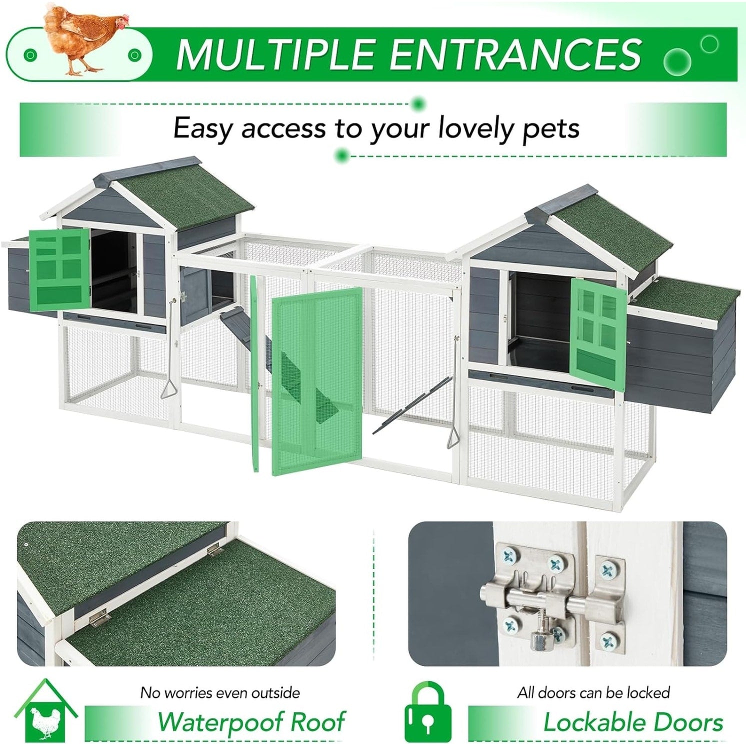 - Large Living Space -- The large chicken coop has a double layer design, with a main house for sleeping on the upper and a running cage protected with wire fenced on the lower. Pets can also have luxury housing.