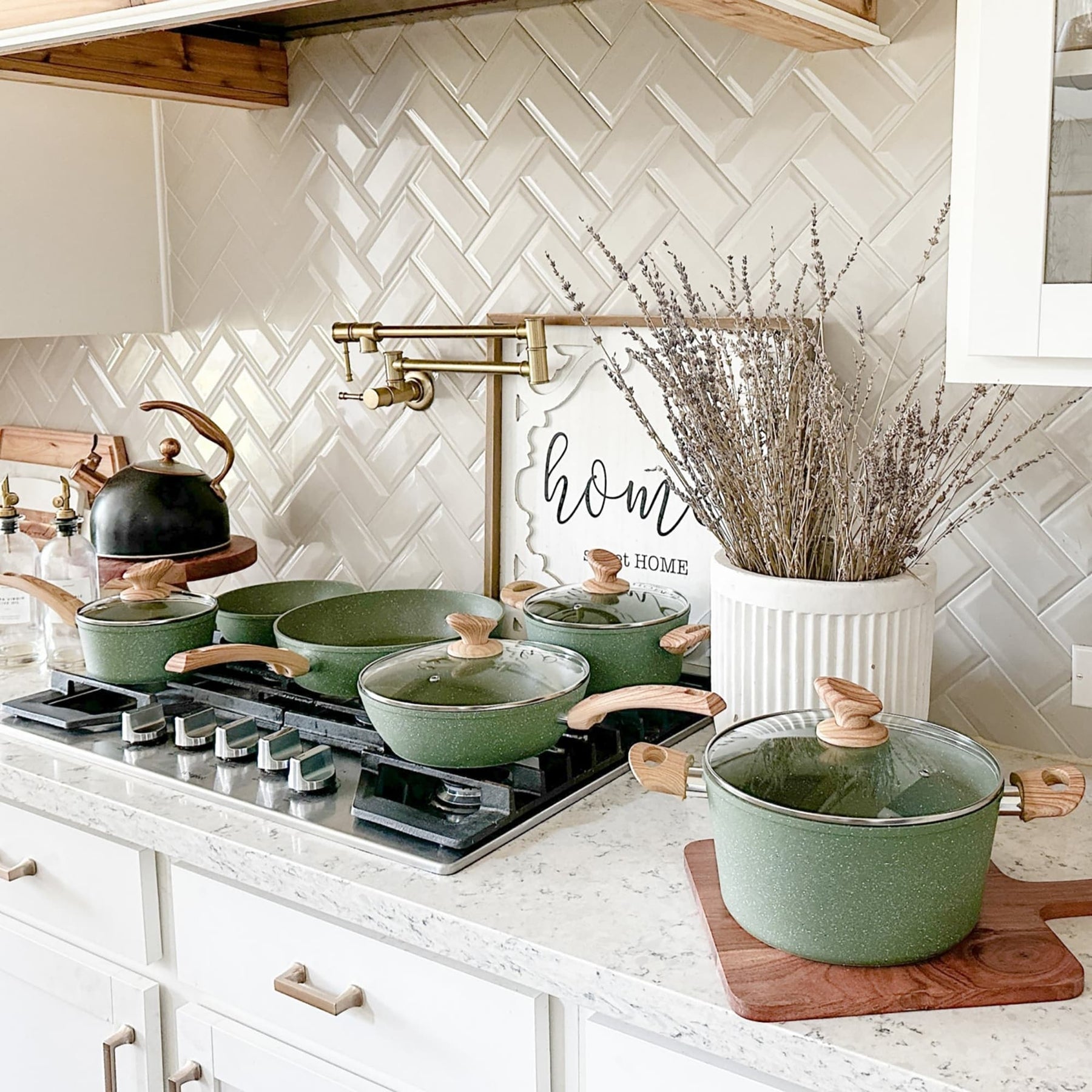 Cook up a storm with the Kitchen Academy Nonstick Granite-Coated Cookware Set. Each piece is designed with forged aluminum bottoms for even heating on all stovetops, including induction. The triple food-grade granite exteriors provide exceptional durability and warp resistance, while the natural marble-coated interiors make cooking and cleaning easy. The wood-look bakelite handles add a touch of style to this versatile set.